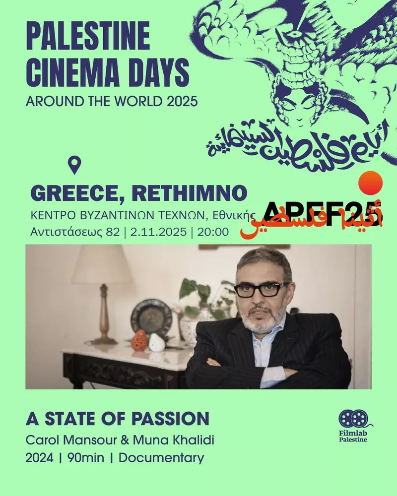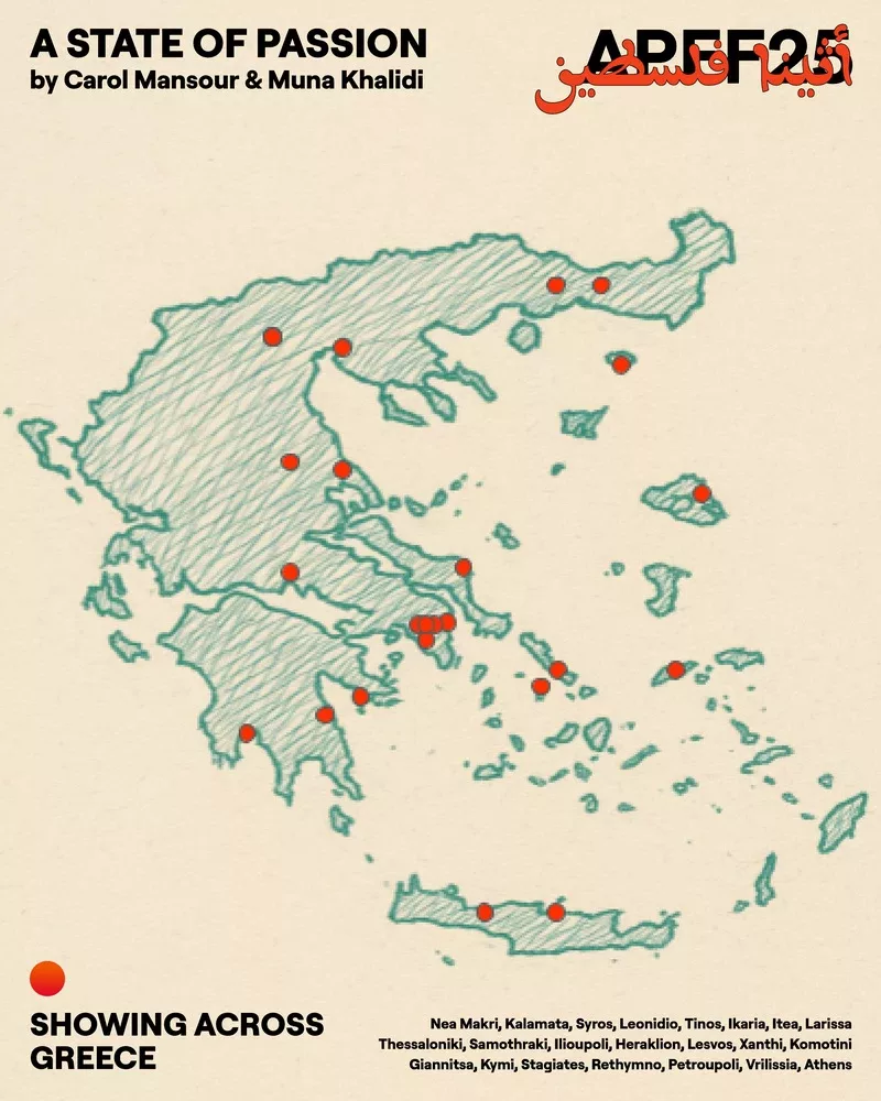 H ταινία 'A State of Passion' θα προβληθεί την ίδια μέρα 2 Νοεμβρίου 2025, σε 23 σημεία σε όλη την Ελλάδα, στα πλαίσια της Διεθνούς Ημέρας Προβολών για την Παλαιστίνη (Palestine Cinema Days: Around The World 2025).