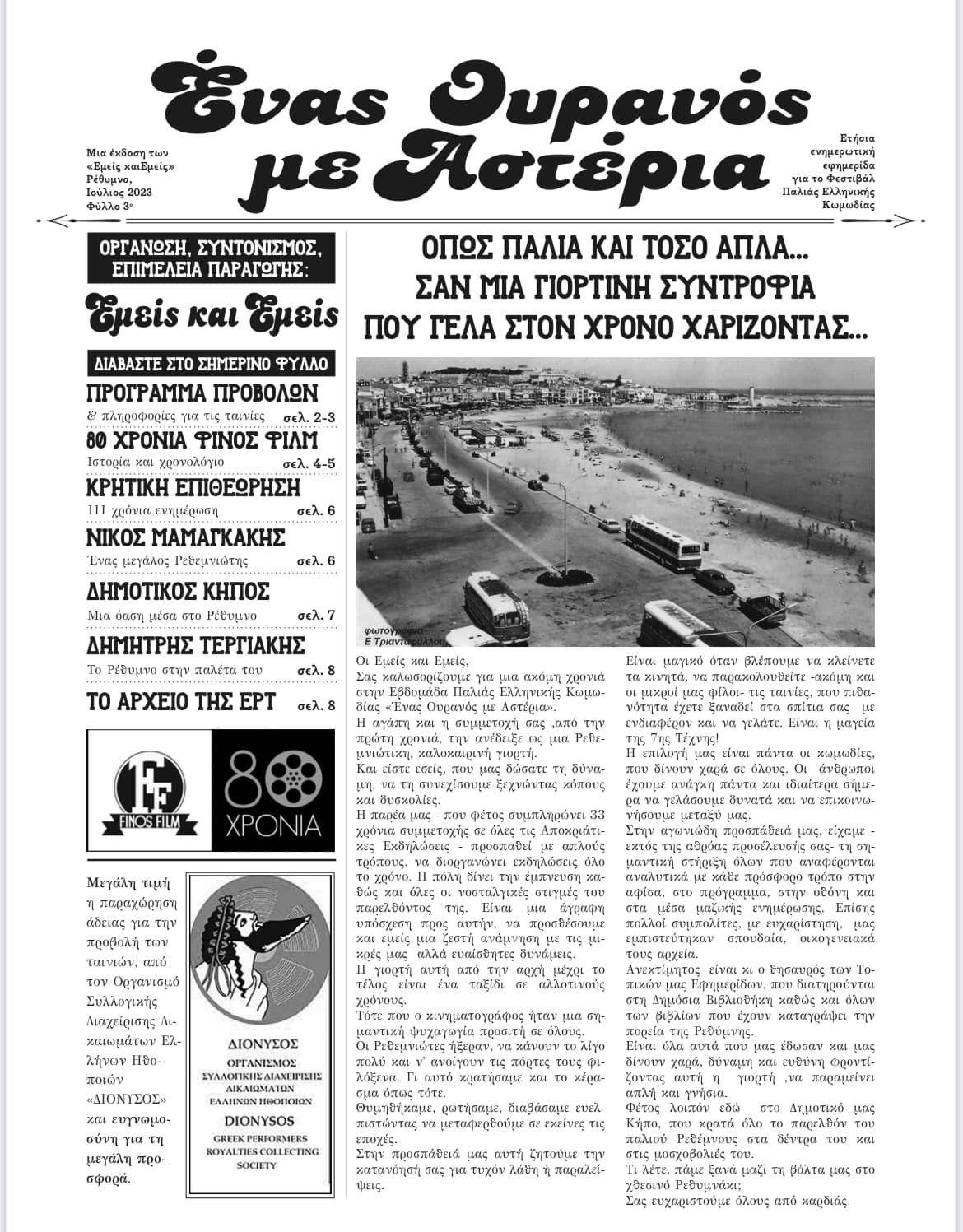 Εφέτος λοιπόν ΕΜΕΙΣ από τη ΦΙΝΟΣ ΦΙΛΜ και… «ΕΜΕΙΣ και ΕΜΕΙΣ» με όλη τη δύναμη της «Φωνής της Καρδιάς μας», σας καλούμε να γιορτάσουμε μαζί στην καρδιά της πόλης, στον ιστορικό Δημοτικό Κήπο Ρεθύμνου με μία εβδομάδα γεμάτη νοσταλγία, ψυχαγωγία, γέλιο και δυνατά αρώματα του… φίνου ελληνικού σινεμά και των λαμπερών αστεριών του.