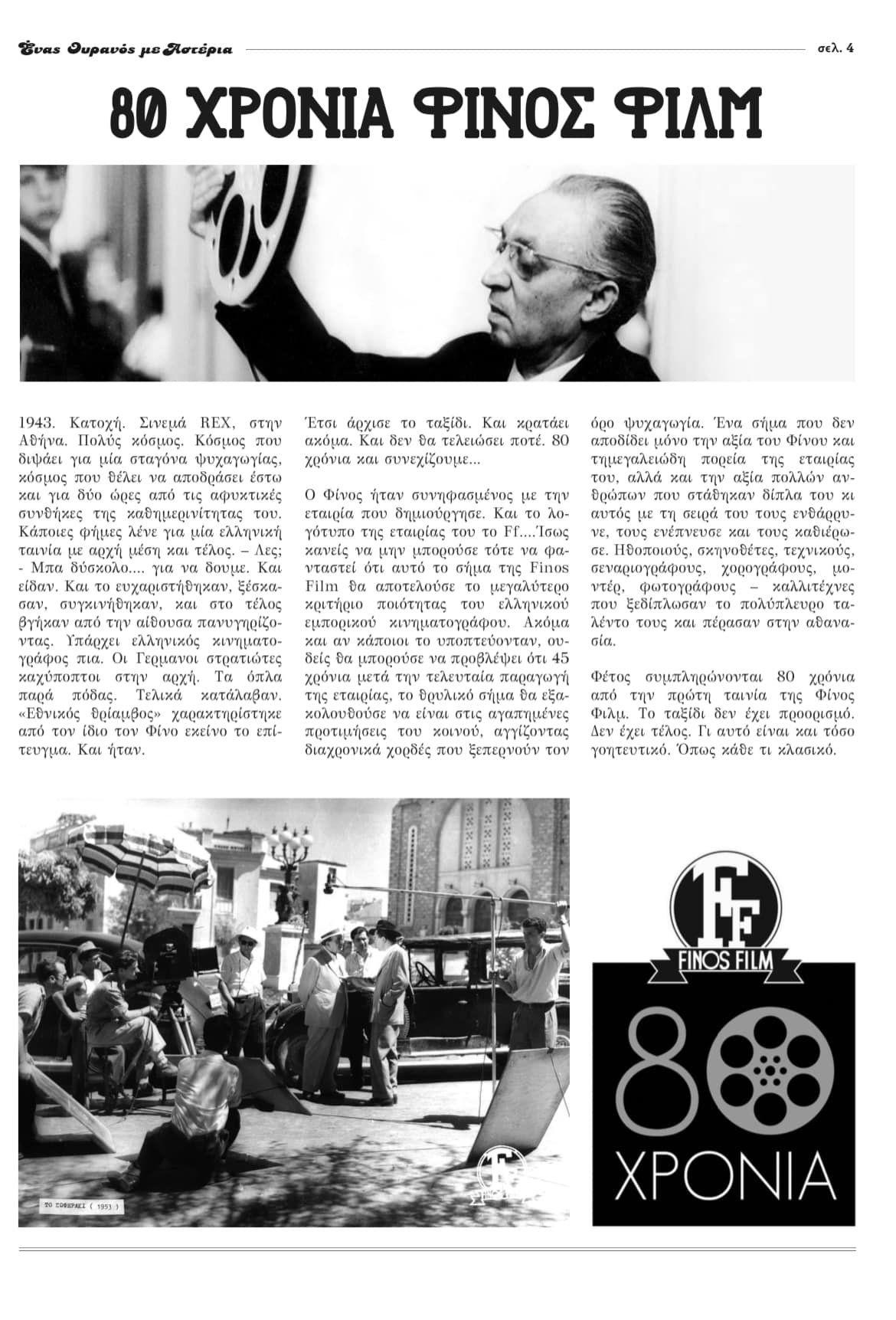 Όσο για εμάς τη... ΦΙΝΟΣ ΦΙΛΜ, η εφετινή γιορτή είναι ξεχωριστή, καθώς συμπληρώνονται 80 χρόνια από την πρώτη ταινία της εταιρίας «Η Φωνή της Καρδιάς» το 1943. Η επιτυχία τότε ήταν τόσο μεγάλη, ώστε χαρακτηρίστηκε ως «Εθνικός Θρίαμβος» από τον ίδιο τον Φιλοποίμενα Φίνο, αλλά και από τους έκπληκτους κριτικούς της εποχής. Και πως να μην ήταν αφού για πρώτη φορά το αθηναϊκό κοινό είδε μία ελληνική ταινία με άρτιες προδιαγραφές παραγωγής, τεχνικής, ήχου και εικόνας…