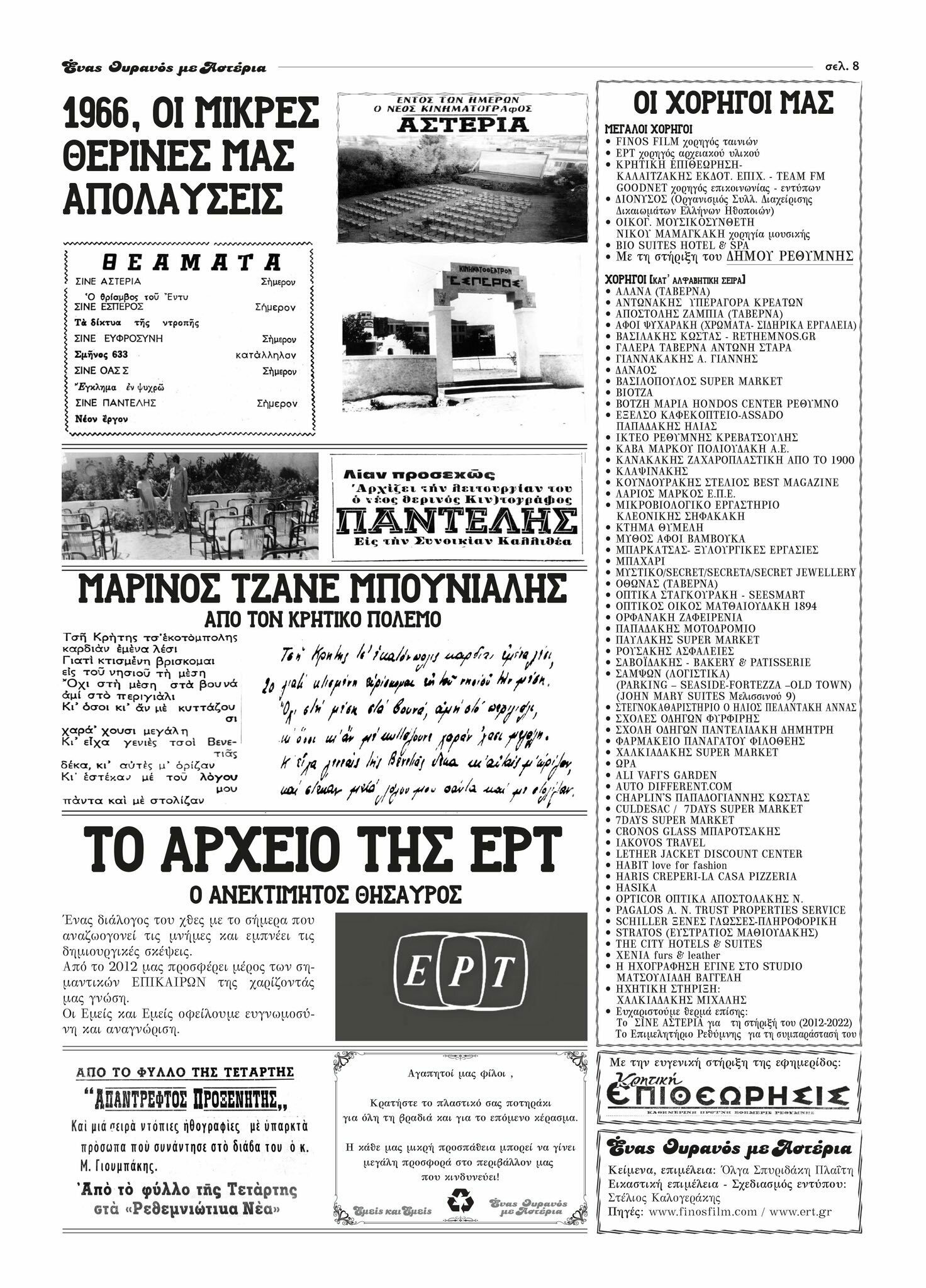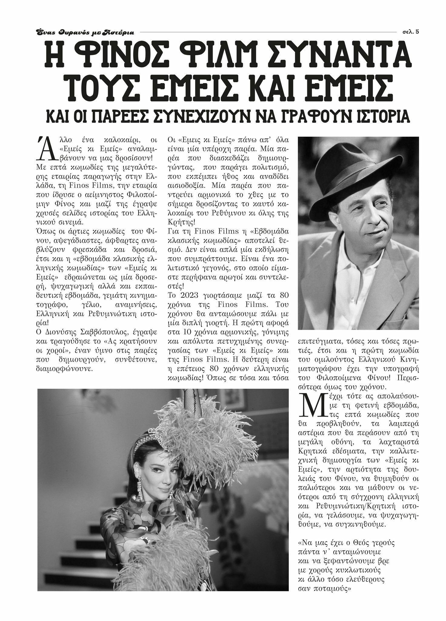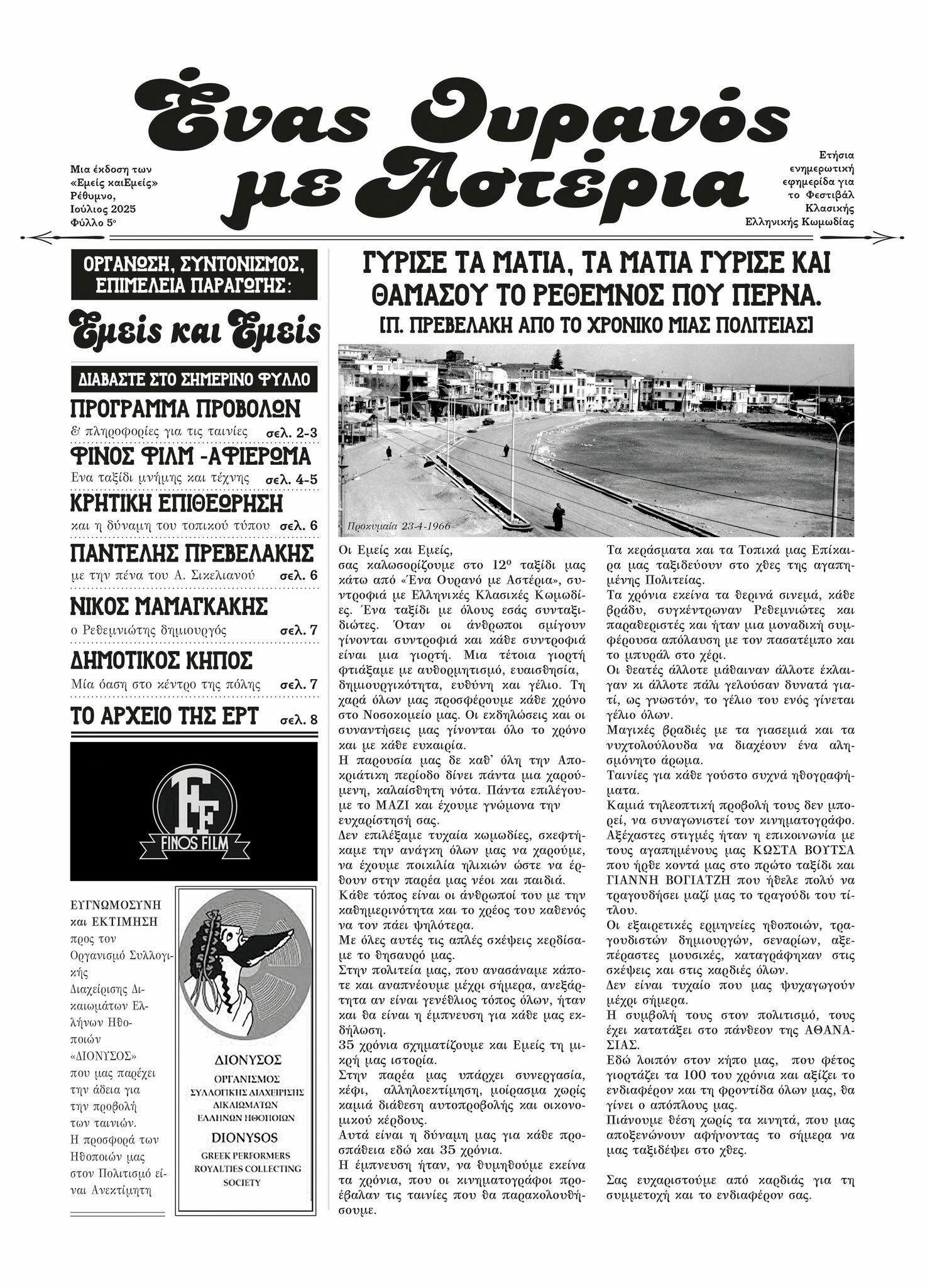 Για ακόμα ένα καλοκαίρι, ο σύλλογος «Εμείς και Εμείς» διοργανώνει στον Δημοτικό Κήπο Ρεθύμνου, εβδομάδα κλασικής ελληνικής κωμωδίας και μας περιμένει καθημερινά κάτω από έναν ουρανό γεμάτο αστέρια, συντροφιά με τα μεγαλύτερα ονόματα του παλιού ελληνικού κινηματογράφου, για βραδιές γεμάτες νοσταλγία, ήχους ξεχασμένους και άρωμα άλλων εποχών…