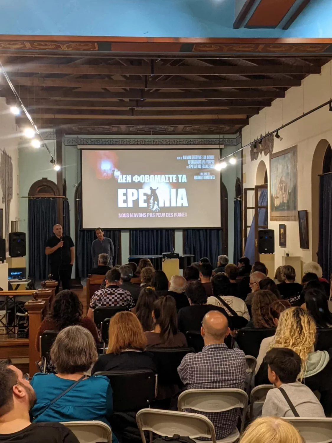 Κατάμεστη ήταν η αίθουσα του Κέντρου Βυζαντινών Τεχνών Ρεθύμνου κατά την προβολή της ταινίας 'Δεν φοβόμαστε τα ερείπια' στις 4 Μαϊου 2025, που πραγματοποιήθηκε με ελεύθερη είσοδο για όλους. Πριν από την έναρξη της προβολής το κοινό που προσήλθε για την ταινία, είχε τη δυνατότητα να γνωρίσει από κοντά τον σκηνοθέτη Γιάννη Γιουλούντα και να δοκιμάσει μια σειρά από γαλλικά κρασιά, προσφορά του σκηνοθέτη.