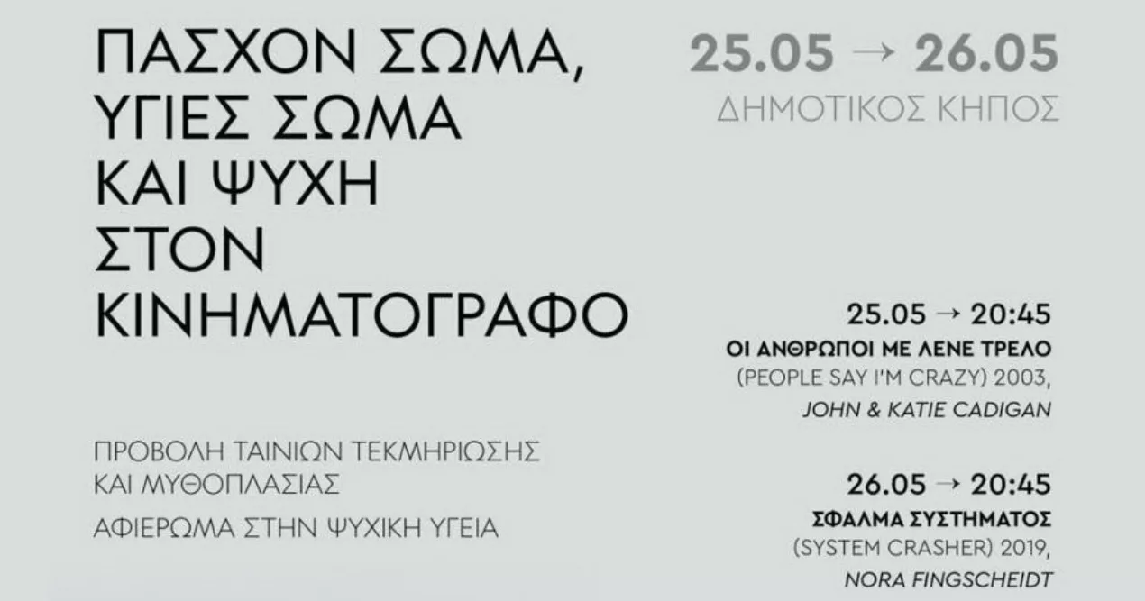 Οι κινηματογραφικές προβολές θα πραγματοποιηθούν στον Δημοτικό Κήπο Ρεθύμνου την Πέμπτη 25 και Παρασκευή 26 Μαΐου στις 20:45 με ελεύθερη είσοδο, ως δράση συνεργασίας μεταξύ Δήμου Ρεθύμνης, Τμήματος Ψυχολογίας Πανεπιστημίου Κρήτης, Συλλόγου Οικογενειών και Φίλων για την Ψυχική Υγεία (ΣΟΦΨΥ) Ρεθύμνου, Κέντρου Ψυχικής Υγείας για Παιδιά και Εφήβους (ΚΟΙ.ΚΕ.ΨΥ.ΠΕ), Μουσείου Ιατρικής Κρήτης, Φεστιβάλ Κινηματογράφου Χανίων, σε συνεργασία με την ταινιοθήκη του Goethe-Institut.