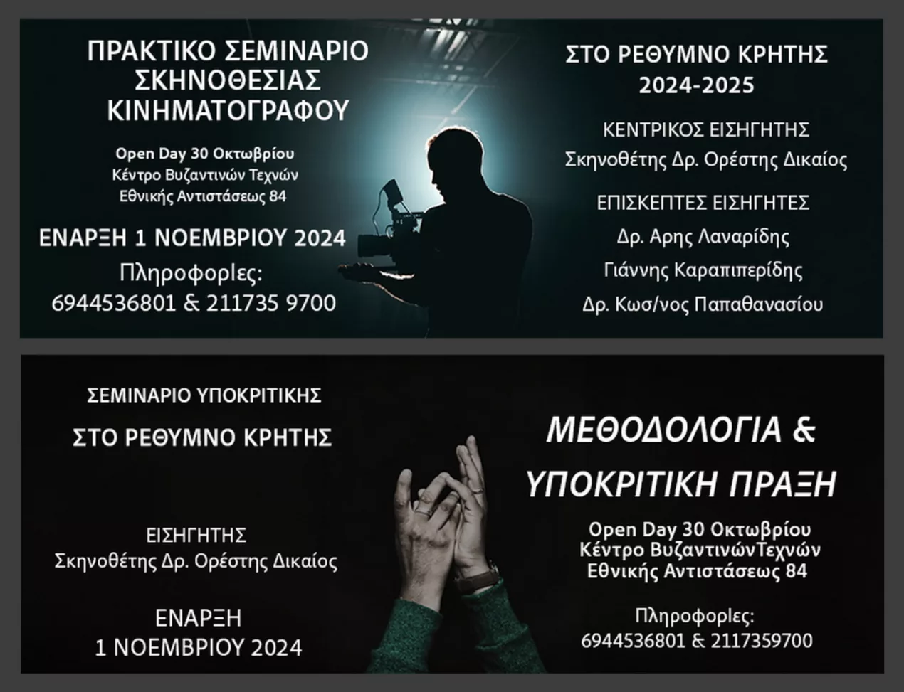 Δύο σημαντικά σεμινάρια θα πραγματοποιηθούν στο Ρέθυμνο από τον Νοέμβριο του 2024 έως τον Μάρτιο του 2025. Πρόκειται για ένα πρακτικό σεμινάριο σκηνοθεσίας κινηματογράφου και ένα σεμινάριο υποκριτικής, τα οποία θα πραγματοποιηθούν από τον Δρ. Ορέστη Δικαίο και επισκέπτες εισηγητές, σε συνεργασία με την Κινηματογραφική Λέσχη Ρεθύμνου.