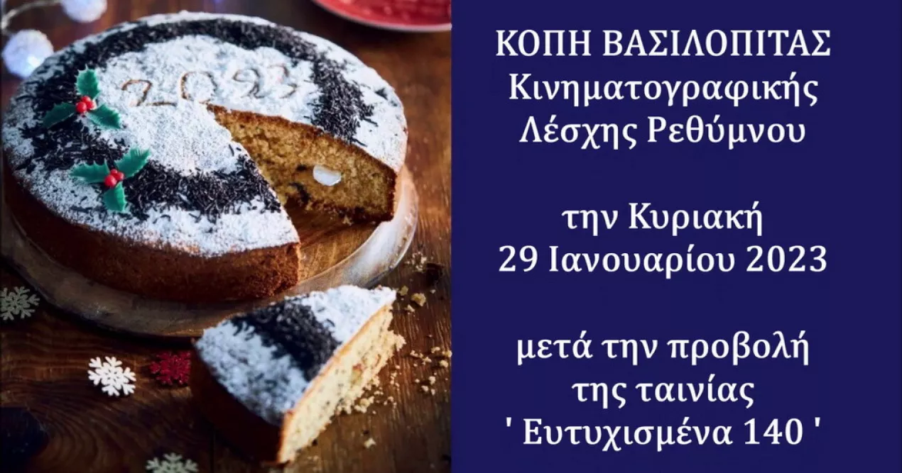 Σε φιλική ατμόσφαιρα έγινε η κοπή βασιλόπιτας της Κινηματογραφικής Λέσχης Ρεθύμνου (ΚΙΝ.ΛΕ.Ρ) την Κυριακή 29 Ιανουαρίου 2023, μετά την προβολή της ταινίας στο χώρο που φιλοξενεί τις προβολές της Λέσχης και δεν είναι άλλος από το Κέντρο Βυζαντινών Τεχνών Ρεθύμνου.
